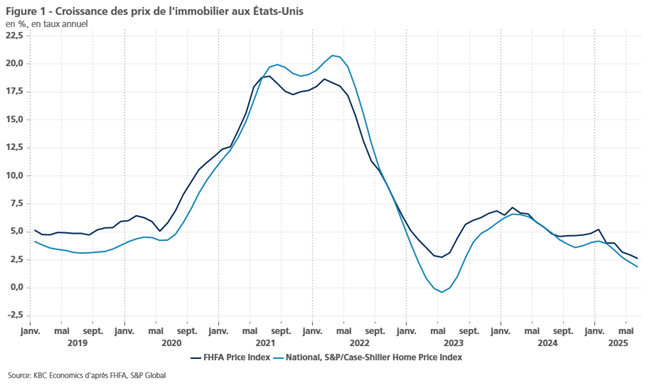Le marché du logement américain est soumis à de fortes tensions. Alors que les taux hypothécaires restent proches de 7 %, que la croissance démographique ralentit et que l’économie est sous pression, les prix des logements diminuent. Au deuxième trimestre, les prix ont baissé de 0,9 % selon l’indice national de l’immobilier S&P/Case Shiller. Les prix sont désormais en baisse depuis le début de l’année et la tendance en glissement annuel se ralentit également de manière significative (voir figure 1).