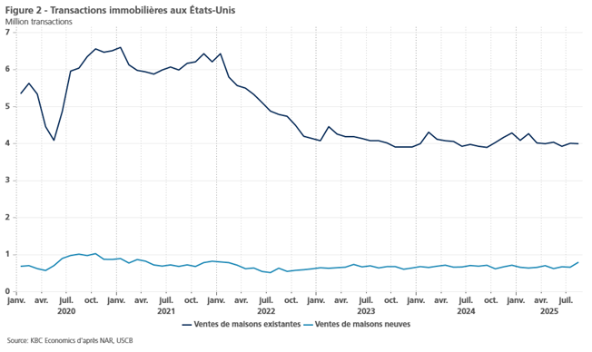Les taux d’intérêt élevés ont rendu l’achat d’un nouveau logement prohibitif pour les candidats à l’accession à la propriété. Dans le même temps, les propriétaires actuels hésitaient à vendre leur maison pour en acheter une nouvelle, car nombre d’entre eux avaient refinancé leur prêt hypothécaire pendant la pandémie à des taux bas. La vente de leur logement les obligerait à refinancer leur prêt hypothécaire à un taux beaucoup moins favorable (voir également notre avis économique de novembre 2023). Pourtant, aujourd’hui, une grande partie des ménages bénéficient de taux hypothécaires plus bas. Le taux d’intérêt hypothécaire effectif était de 4,1 % au deuxième trimestre 2025, ce qui est encore bien inférieur au taux des nouveaux prêts hypothécaires. Selon une étude menée par Realtor, un site d’annonces immobilières, 72,1 % des détenteurs de prêts hypothécaires avaient encore un taux d’intérêt impayé inférieur à 5 % au quatrième trimestre 2024. 20,9 % paient encore des taux hypothécaires inférieurs à 3 %. Lentement mais sûrement, les contrats de prêts hypothécaires à taux bas se terminent et davantage de propriétaires pourraient être incités à vendre leur maison. Cela pourrait accroître l’offre sur le marché et exercer une nouvelle pression à la baisse sur les prix.