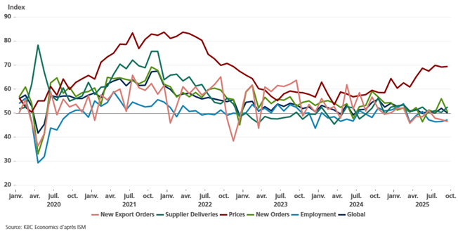 Si la baisse des taux de la part de la FED en octobre est totalement intégrée par le marché, l’inflation demeure un sujet de préoccupation et le niveau du sous-indice des prix de l’indice ISM non manufacturier ne rassure évidemment pas.