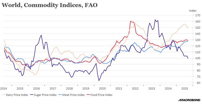 Le prix de la viande continue sur sa lancée, en hausse de 6,6% sur un an, et affiche un nouveau record. Cette hausse a surtout été le fait de la viande ovine et de la viande bovine, cette dernière ayant atteint un niveau record, sous l’effet d’une forte demande aux États-Unis, où les disponibilités intérieures limitées et un écart de prix favorable ont continué à encourager les importations.