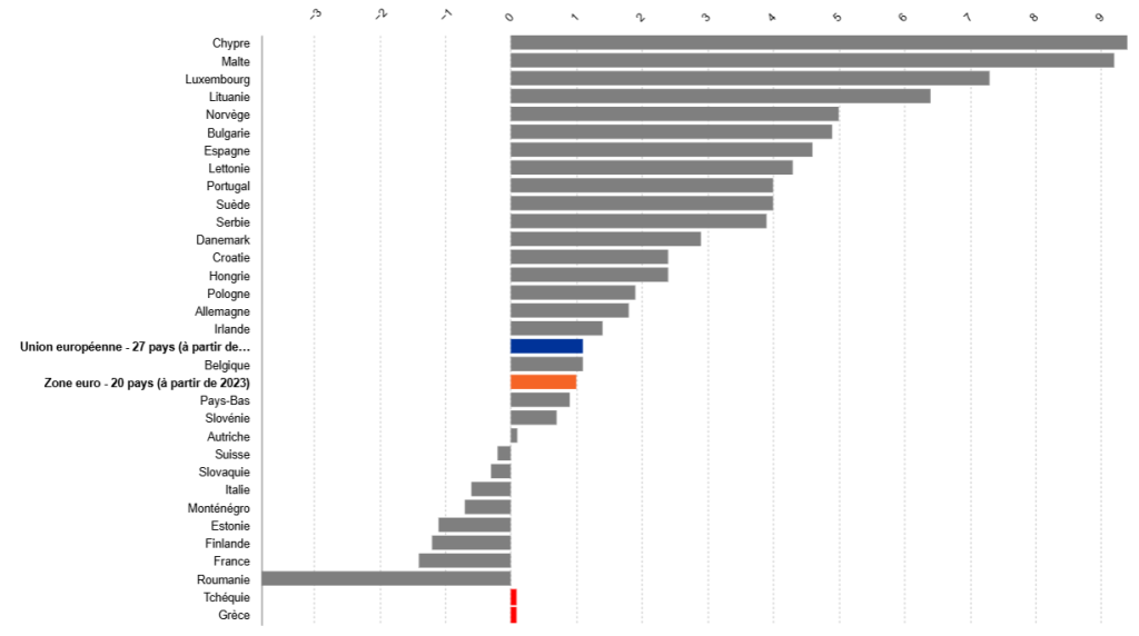 Comme le montre le tableau, les disparités sont importantes au sein de l’UE sur l’évolution des ventes de détail sur un an, mais en revanche, la France est pratiquement la lanterne rouge avec une baisse de 1,4%, selon les chiffres d’Eurostat.