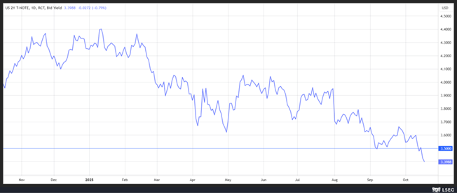 Le dollar a aussi reculé suite à la baisse du rendement du Treasury 2 ans en dessous du seuil de 3,50%, alors que les anticipations de baisse de taux de la part de la FED s’accentuent.