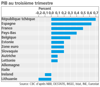 Les chiffres de croissance, publiés hier matin, ont confirmé que l’économie dans la zone euro faisait preuve de résilience et qu’elle avait même progressé un peu plus rapidement que prévu au troisième trimestre, grâce à une croissance soutenue en France et en Espagne, et malgré une stagnation en Allemagne et en Italie. La croissance a été de 0,2% pour la zone euro au troisième trimestre, soit un taux annuel de 1,3%.