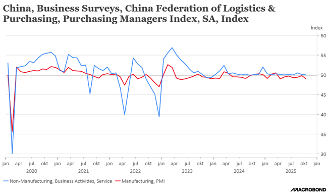 Comme le montre le graphique, l’indice PMI du secteur non manufacturier est passé de 50,0 à 50,1 en septembre, ce qui le maintient à son niveau neutre.