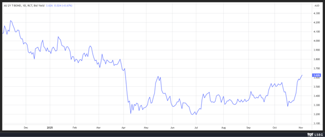Message que le marché a directement intégré en provoquant une hausse du rendement de l’obligation australienne à 2 ans, mouvement déjà amorcé après les chiffres d’inflation.