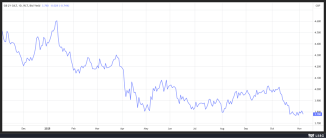 Le rendement de l’obligation en sterling à 2 ans a déjà complètement intégré cette baisse de taux de décembre.
