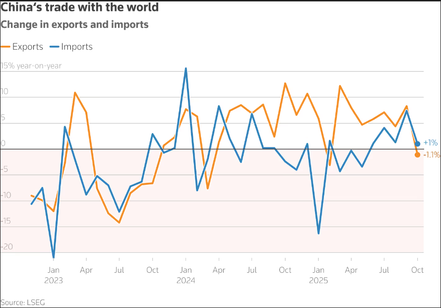 Les exportations de la Chine ont chuté de manière inattendue en octobre de 1,1% en taux annuel contre un taux de 8,3% en septembre.