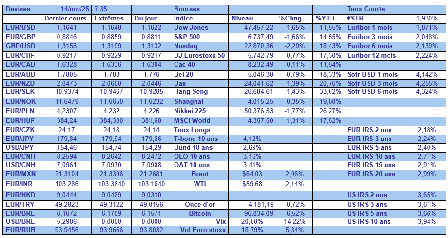 Le doute s’insinuant de plus en plus sur la probabilité d’une baisse des taux de la part de la FED en décembre, cela a provoqué une baisse concomitante du dollar, des bourses, et du bitcoin, avec en contrepartie une hausse des taux et de la volatilité.