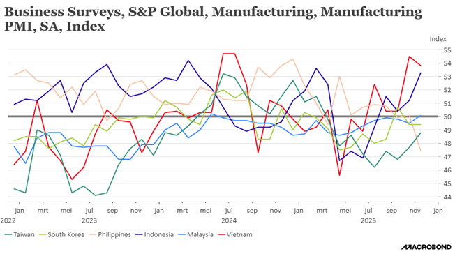 L’industrie chinoise n’est pas la seule à avoir connu une activité morose en novembre. Cela a également été le cas pour le Japon, la Corée du Sud, Taïwan et les Philippines, alors que d’autres ont connu une embellie comme l’Indonésie, comme le montre le graphique.