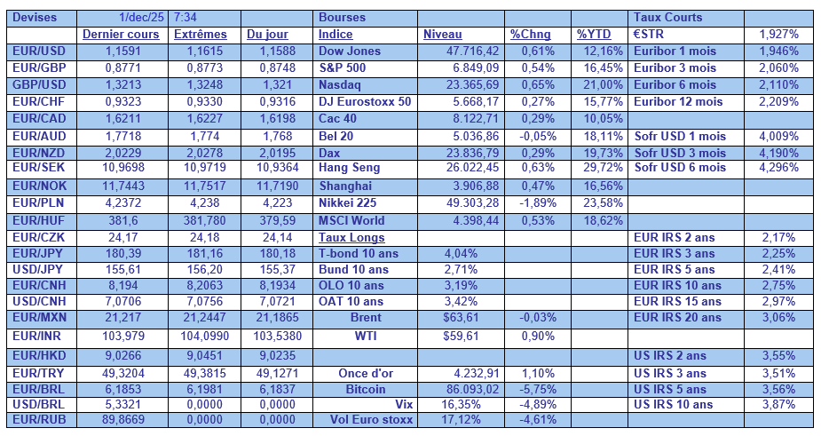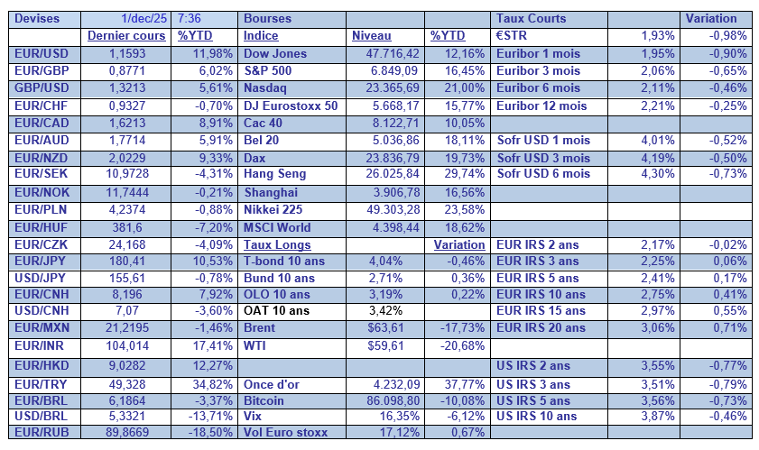 Dans le tableau mensuel, il faut souligner qu’il n’y a pas que le Nasdaq qui affiche une excellente performance cette année, le DAX n’a vraiment pas à rougir, ni les indices en Asie. Le dollar est bien parti pour terminer l’année en recul de 12 % par rapport à l’euro.