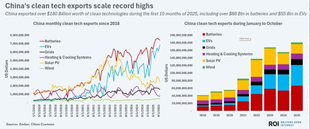 Toujours selon Ember, la Chine ne s’arrête pas là puisqu’elle a exporté pour plus de 180 milliards de dollars de technologie propre (batteries, véhicules électriques représentant 100 milliards) sur les dix premiers mois de 2025.