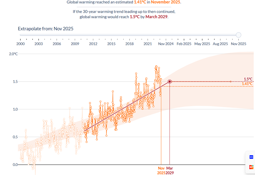Malgré cela, rappelons le défi qui nous attend. Et pour cela j’ai repris les données publiées par Copernicus, qui reprend ce graphique. Ce dernier essaie de répondre à la question : à quel point sommes-nous proches d’un réchauffement planétaire de 1,5˚C ?