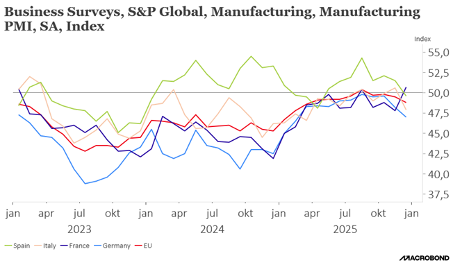 Mais à la différence de l’Espagne, c’est le rebond de novembre qui était sans doute une anomalie, car l’industrie manufacturière italienne est en plein marasme depuis le début de l’année 2023. Et clairement cela ne devrait pas beaucoup s’améliorer en 2026.