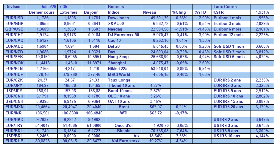 Compte tenu d’une inflation proche de son objectif, a priori, la BCE ne devrait pas bouger à ses taux tout au long de cette année. Seul élément qui pourrait l’inciter à baisser ses taux, une appréciation trop forte de l’euro par rapport au dollar, mais le renforcement de ce dernier à 1,18 actuellement, ne le justifie nullement.