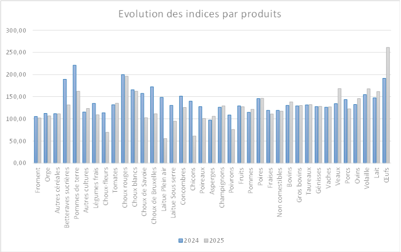 Mais, comme le montre le tableau, ce recul n’est pas généralisé. S’il provient principalement de la chute des produits végétaux (‑14,2 %), et plus particulièrement des grandes cultures (‑18,7 %), par contre, les produits animaux progressent de 12,5 %, soutenus notamment par l’augmentation de l’indice des œufs (+36,4 %).
