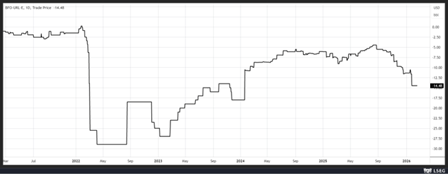 Depuis novembre, la Chine a remplacé l’Inde en tant que principal client de Moscou pour les expéditions maritimes, à des conditions particulièrement avantageuses comme le montre le graphique qui reprend la différence de prix entre le Brent et l’Urals (ou Oural).
