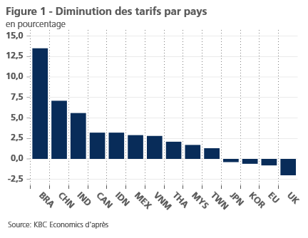 Bien que la décision limite les politiques commerciales de M. Trump, le président dispose d’autres options pour imposer des droits de douane sans avoir besoin de l’approbation du Congrès. Il a presque immédiatement invoqué l’article 122 de la loi sur le commerce de 1974 pour imposer un droit de douane global de 10 %. Le lendemain, il a annoncé une augmentation des droits de douane à 15 %. L’article 122 permet à M. Trump d’imposer des droits de douane à tous les pays pour répondre aux besoins de la balance des paiements ou pour empêcher une dépréciation importante du dollar. L’article 122 est toutefois assorti de contraintes. L’approbation du Congrès est nécessaire après 150 jours. En outre, le pourcentage maximal autorisé par l’article 122 est de 15 %. Comme de nombreux pays étaient soumis à des droits de douane plus élevés avant l’adoption de la décision, ils seront heureux de voir leurs droits de douane effectifs diminuer (voir figure 1). Certains pays, comme le Royaume-Uni, qui étaient soumis à des droits de douane moins élevés, verront leurs droits de douane augmenter légèrement. Le taux tarifaire effectif de l’UE augmentera également, car moins de marchandises seront exemptées du taux de 15 %. Dans l’ensemble, comme de nombreux pays voient leurs droits de douane baisser pour l’instant, le taux effectif des droits de douane passe de 16 % avant la décision à 13,7 % aujourd’hui.