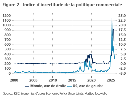 Après le jour de la libération, l’incertitude commerciale a atteint un niveau sans précédent (voir figure 2). Bien qu’elle se soit atténuée depuis, elle reste à des niveaux très élevés. La décision actuelle maintiendra l’incertitude à un niveau élevé au cours des prochains mois, car l’administration annoncera progressivement de nouveaux droits de douane au titre des sections 301 et 232 et plusieurs accords commerciaux devront être renégociés.