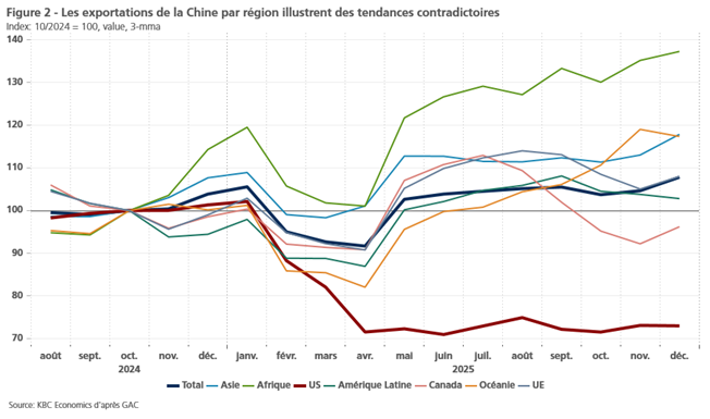 Malgré la résistance des exportations chinoises en 2025, l’augmentation des droits de douane imposée par les États-Unis a eu un impact négatif évident sur le commerce sino-américain. Les exportations chinoises vers les États-Unis ont considérablement diminué depuis avril 2025 (figure 2). Et bien que la désescalade de mai 2025 entre les deux pays ait pu freiner le déclin, les exportations chinoises vers les États-Unis n’ont pas connu de reprise significative, même après la signature d’une trêve commerciale d’un an en octobre 2025. Il pourrait être tentant de suggérer que l’amélioration compensatoire des exportations vers d’autres régions est simplement un cas de transbordement. En d’autres termes, les producteurs chinois expédient leurs produits vers des pays tiers, en particulier en Afrique, avant de les envoyer aux États-Unis pour éviter des droits de douane plus élevés. Mais alors que les importations américaines en provenance d’Afrique (sur une base mobile de 12 mois) ont augmenté presque exactement au même rythme que les exportations chinoises vers l’Afrique entre novembre 2024 et juin 2025 (+12,5 %), tout au long du second semestre 2025, les exportations chinoises vers l’Afrique ont continué à croître fortement (+14 %) tandis que les importations américaines en provenance d’Afrique se sont stabilisées et ont même baissé (-2,45 %). Cela suggère que, si le transbordement peut jouer un rôle, le succès des exportations chinoises est plus profond.