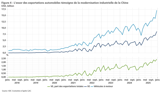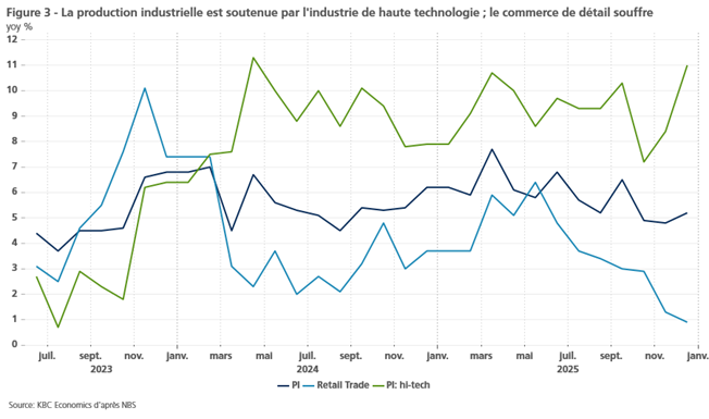 La modernisation industrielle est depuis longtemps un objectif du gouvernement chinois. Il s’agit d’utiliser des investissements ciblés pour remonter la chaîne de valeur dans l’industrie manufacturière, accroître l’automatisation dans le secteur manufacturier et soutenir l’indépendance stratégique dans des secteurs clés de haute technologie (IA, informatique quantique, semi-conducteurs, technologies vertes). Cette stratégie porte ses fruits. La production industrielle a été l’un des principaux moteurs de la croissance chinoise ces dernières années, notamment grâce à la fabrication de produits de haute technologie (figure 3).