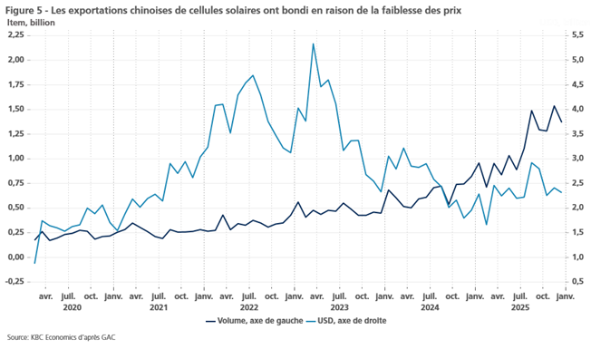 L’augmentation de la fabrication de haute technologie est évidente lorsqu’on examine la répartition des exportations de marchandises de la Chine. Prenons par exemple les exportations chinoises d’automobiles, qui ont augmenté de 285 % depuis 2021. Une grande partie de cette croissance est due aux exportations de voitures électriques, qui ont augmenté de 362 % au cours de la même période (figure 4). On observe une tendance similaire pour les exportations chinoises de cellules solaires qui, en termes de volume, ont augmenté de 415 % depuis le début de l’année 2022 (figure 5). Au cours de la même période, la valeur de ces exportations de cellules solaires (mesurée en USD ou en CNY) a légèrement diminué, ce qui montre que le faible coût des exportations chinoises de haute technologie joue un rôle important dans le succès de ces exportations.