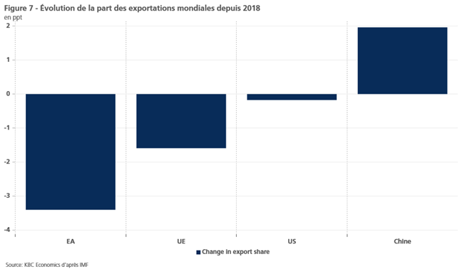 Les exportations à bas prix en provenance de Chine ont des conséquences évidentes sur les marchés concurrents à l’étranger. L’industrie automobile européenne en est un exemple clé. Auparavant, l’UE exportait systématiquement plus de véhicules vers la Chine qu’elle n’en importait. Toutefois, à partir de 2021, les exportations de véhicules de l’UE vers la Chine ont commencé à diminuer régulièrement, tandis que les exportations de véhicules chinois vers l’UE ont commencé à augmenter régulièrement. Les chiffres se sont croisés à la fin de 2023 et l’écart continue de se creuser, ce qui signifie que la Chine exporte désormais plus de véhicules vers l’UE qu’elle n’en importe de l’UE (figure 6). Ce phénomène propre à l’industrie est également évident dans une perspective plus large ; depuis 2018, les économies avancées ont perdu des parts de marché mondiales pour leurs exportations, tandis que la Chine en a gagné de manière significative (figure 7).