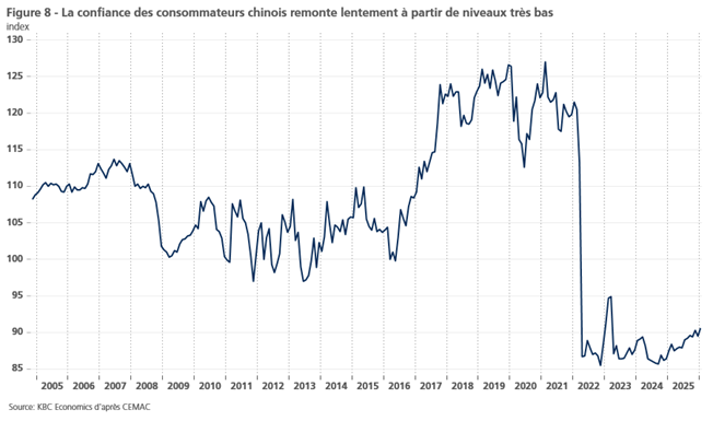 Le taux d’épargne des ménages chinois (en pourcentage du revenu disponible) est depuis longtemps beaucoup plus élevé que celui des autres économies (35 % en 2019, contre 6 % dans l’UE et 7,5 % aux États-Unis). Comme dans d’autres économies, le taux d’épargne a encore augmenté pendant les années de pandémie. Alors que dans de nombreuses économies, cette épargne supplémentaire s’est au moins partiellement résorbée après la pandémie, les intentions des consommateurs chinois d’épargner n’ont fait qu’augmenter. Au quatrième trimestre 2025, 63 % des consommateurs prévoyaient d’épargner davantage à l’avenir, contre 46 % il y a six ans, selon une enquête menée auprès des consommateurs.