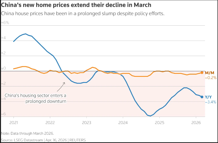 Conséquence, les prix des logements neufs ont continué de baisser en mars, affichant un recul de 0,2 % contre une baisse de 0,3 % en février, soit sur un an une chute de 3,4 % contre 3,2 % en février.