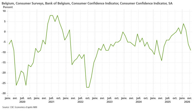 En Belgique, la confiance des consommateurs, publiée par la BNB, a reculé et est tombée à son niveau le plus bas depuis avril 2025.